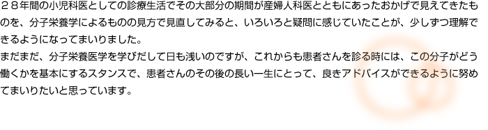 医学部で習った生化学とは比べものにならない、臨床症状に関連付けられた、分子栄養学でした。目からうろこが落ちる思いでした。