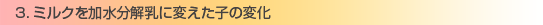 加水分解乳を与えて軽快したのは、ミルク蛋白があらかじめ低分子化されておりつながっているアミノ酸の数が少ないため、消化機能の弱い子(胃液の質が悪いとか胃酸の出方が悪いと考えられる)でも、1個のアミノ酸に変化させることができたためであると考えられます。1つ1つのアミノ酸に変化していれば、小腸粘膜で吸収されたとき異種蛋白と認識されません。つまりIgE抗体も産生されません。(ですから、IgE抗体が高いというのは、栄養障害による結果と見ることができます。アトピーの原因とみなすから混乱が生じるのではないのでしょうか?)