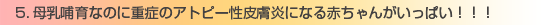 ところが、完全母乳で育てた赤ちゃんにも重症のアトピー性皮膚炎の子が出てしまいました。お母さんが昔アトピー性皮膚炎であった方、上の子がアトピー性皮膚炎であった方などでした。これが、なぜだか、このときは説明がつけられず、やっぱり体質なのかなーとがっかりいたしました。印象的だった赤ちゃんは、生まれて1週間以内に便秘をして お腹がはってしまった子ですが、生後3ヶ月あたりより重症のアトピーになりました。