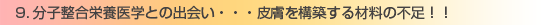 体は37兆個の細胞でできています。その細胞を作る材料が足りなければ、障害が出てきてしまいます。皮膚や粘膜は細胞分裂の盛んな組織であり、常にたんぱくや亜鉛、鉄などのミネラルや、分化に必要なビタミンA、蛋白代謝にかかわるビタミンB群などが、健康な皮膚を作るためには供給されなければなりません。また、炎症の部位で増える活性酸素を消去するためにビタミンCやビタミンEなども必要です。