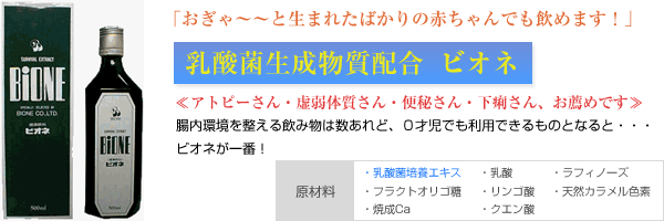 しかし、最近みつけたビオネという乳酸菌生産物質は味も十分に満足できるものです。この味なら赤ちゃんや小さなお子様でも嫌がらずに飲めると思います。 私の子供などは、50ccのビンを一息に飲んでしまいます。私も以前の乳酸菌生産物質はオリゴ糖などで味を付けて何とか飲んでいたのですが、どうしても無理して飲んでいるという気分でした。ところがこのビオネならとっても美味しいのですぐに飲み終わってしまうのです。このビオネという乳酸菌生産物質は推薦するに値すると判断しましたので、パンフレットをご紹介したいと思います。