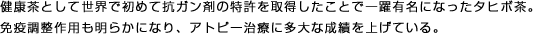 今回の特許取得は健康食品業界だけでなく、食品業界全体においても快挙といえる。上田助教授は、タヒボ茶には人体を傷つけたりダメージを与えたりせずに、ガン細胞だけを選別して攻撃し、死滅させるという優れた制ガン作用があり、同時に副作用がまったくないことを明らかにしている。さらに、タヒボ茶は制ガン作用だけでなくさまざまな薬効が認められており、最近注目されているのが、アトピー性皮膚炎をはじめとするアレルギー性疾患に対する作用である。
